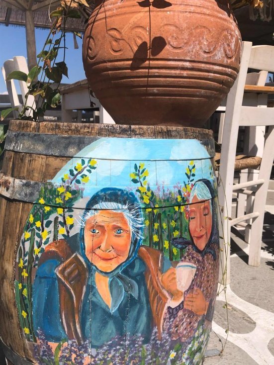 Wandelend langs de gezellige boulevard van Milina kwam mijnheer Van Lierop dit kunstig beschilderde vat tegen.