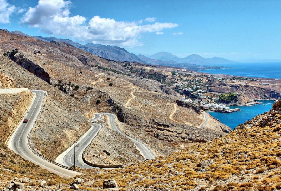 Als je vanaf de Aradena-kloof naar Plakias rijdt dan kom je via deze slingerweg in Chora Sfakion terecht.