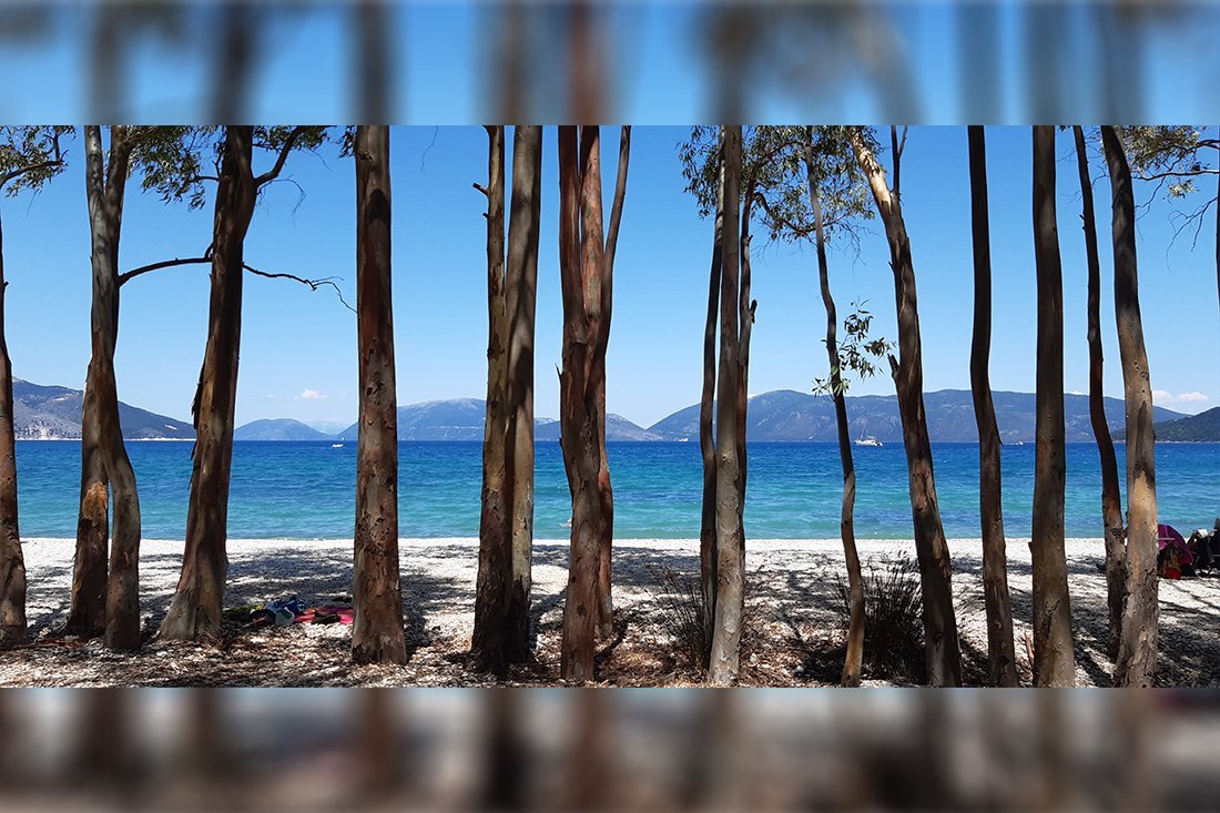 Mijnheer Lakkas maakte op Kefalonia een wandeling en pauzeerde even bij deze schaduwrijke bomenrij tussen Karavomilos en Sami.
