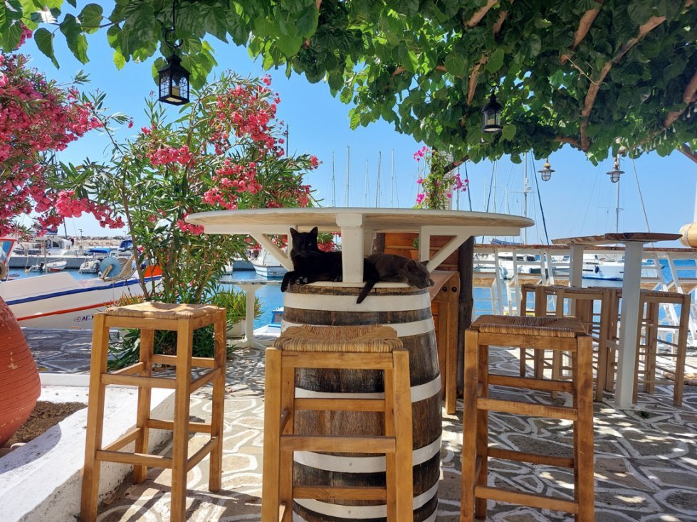 Mevrouw Denneman bezocht de haven van Ormos toen zij twee katjes zag die heerlijk in de schaduw aan het rusten waren.