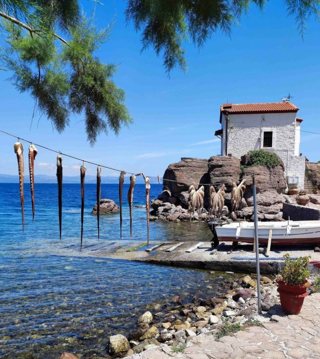 Mevrouw Kemperman is van mening dat het leuke vissershaventje van Skala Sykaminia elke keer weer een bezoek waard is. Hier legde zij dit typische plaatje vast.