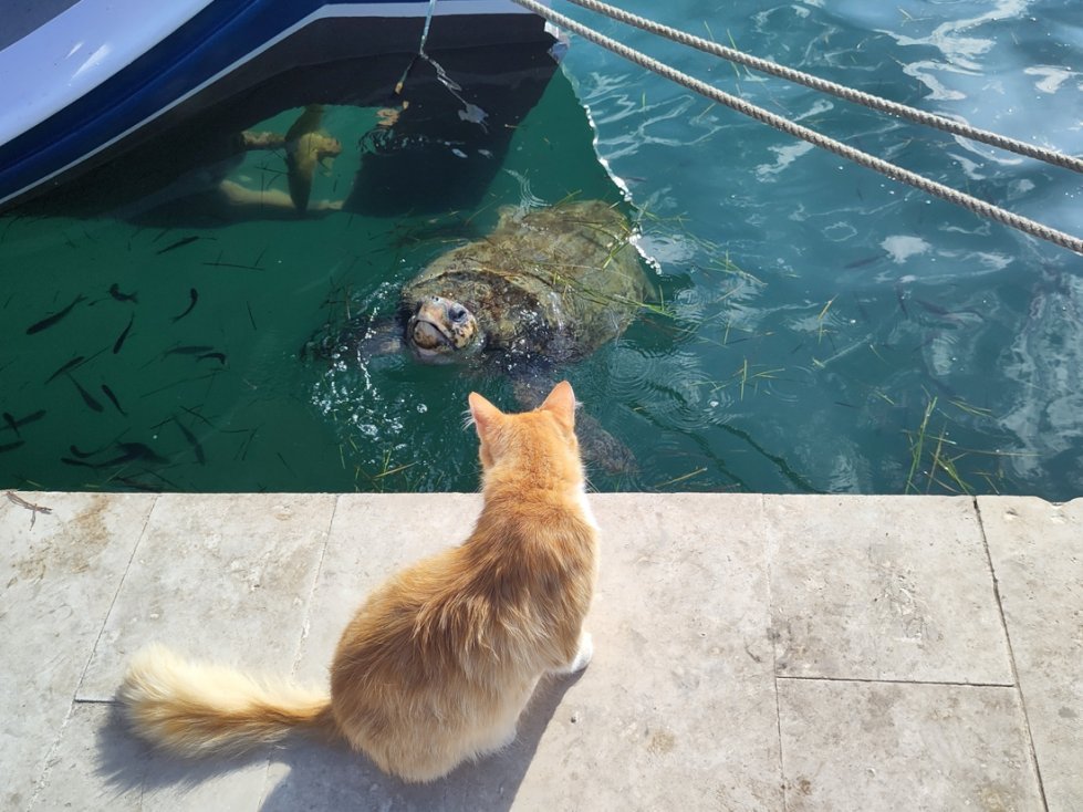 Mijnheer Bakker stuitte tijdens zijn vakantie op Kefalonia op een uniek moment tussen dit bijzondere duo in de haven van Argostoli.