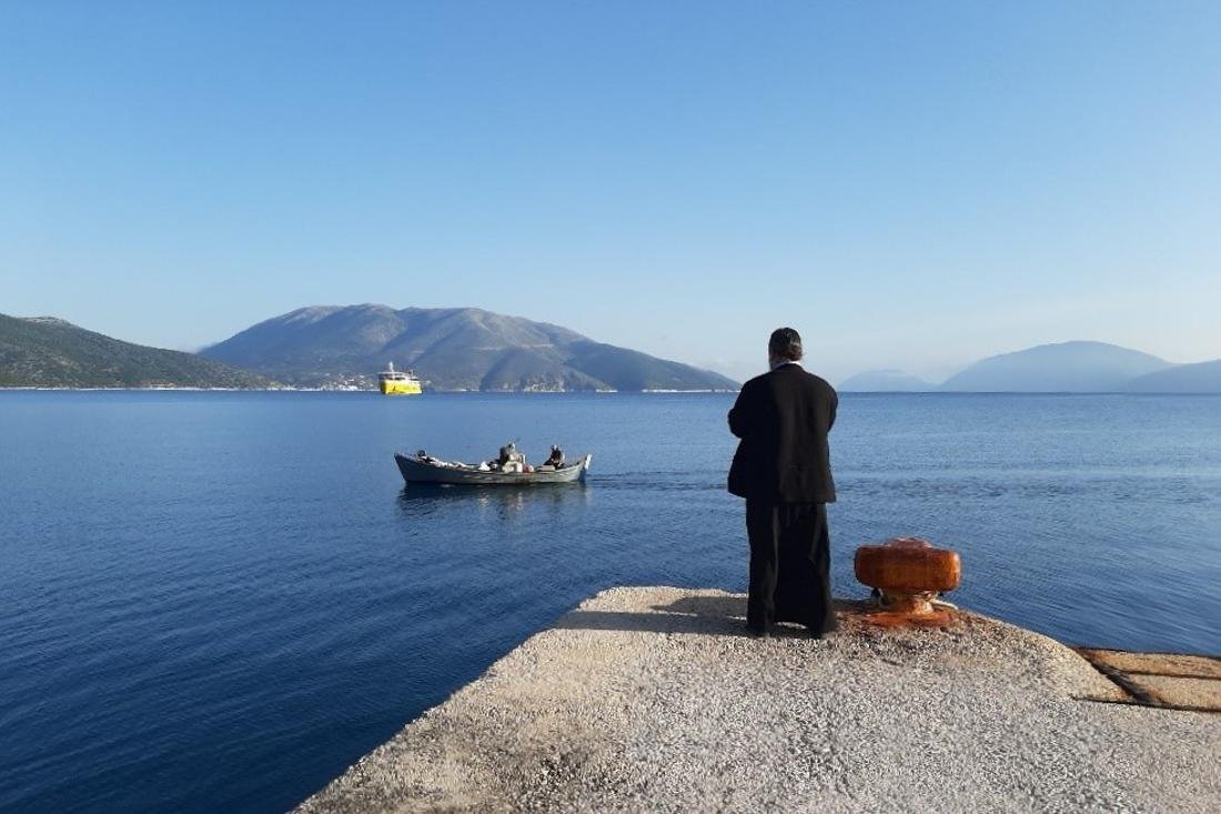 Mevrouw Nieborg fotografeerde deze Griekse priester die op de ferry van Ithaki naar Kefalonia stond te wachten.