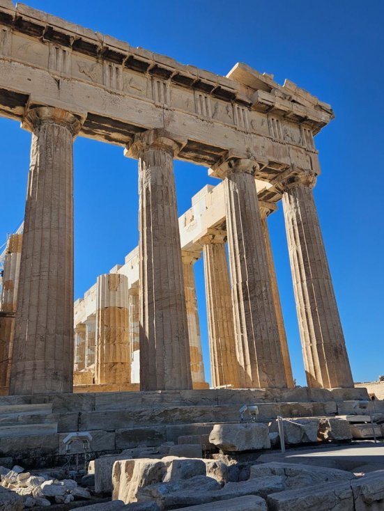 Mevrouw Geerds en mevouw Hekstra bezochten de Acropolis en fotografeerden daar de zuilen van het Parthenon tijdens Stefanos' bijzondere reis Zakynthos & de Peloponnesos.