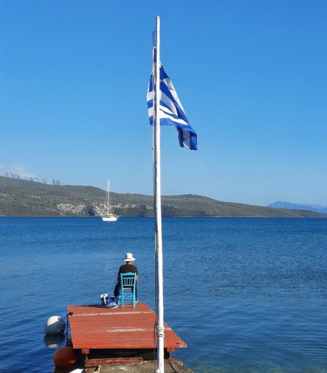 De steiger bij Huize Seven Islands met op de achtergrond de bergen rond Paleros fotografeerde mevrouw Regeer-Heemskerk tijdens haar vakantie op Lefkas dit Griekse tafereel in Lygia.