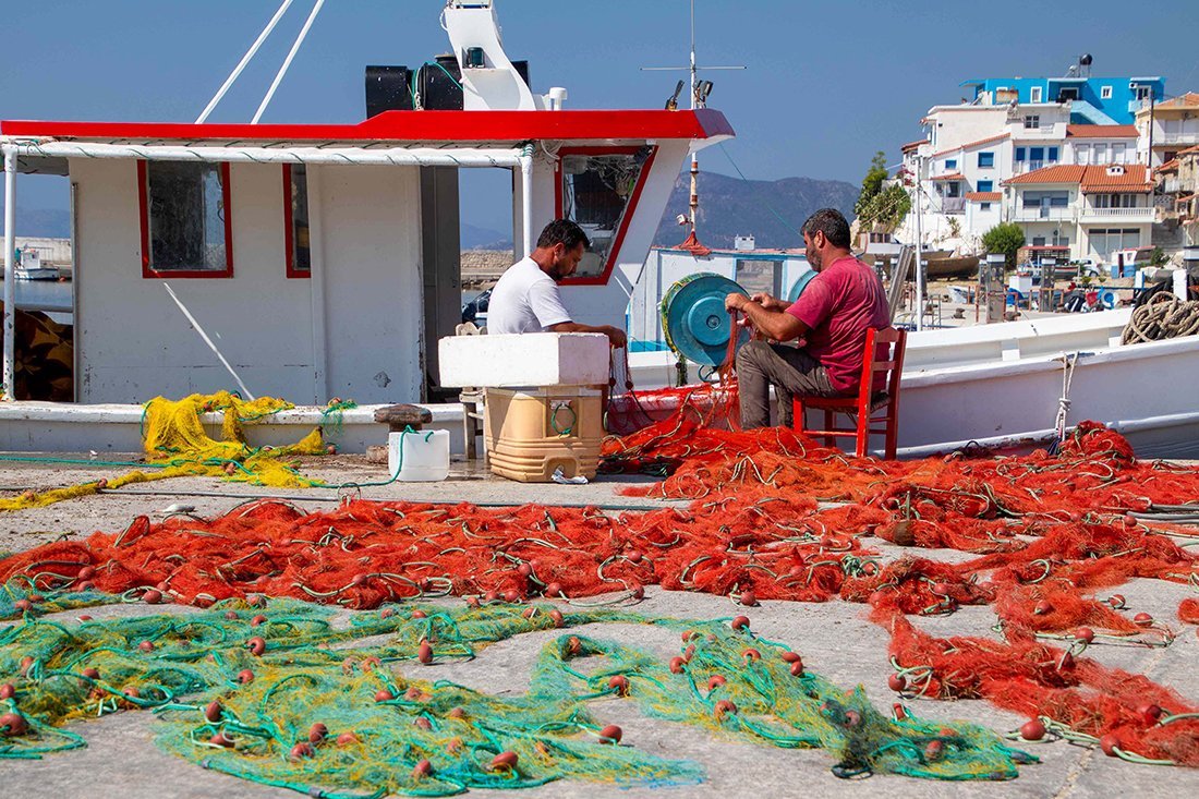 Familie De Beus fotografeerde op Samos deze vissers met hun vrolijk gekleurde netten in de haven van Ormos.