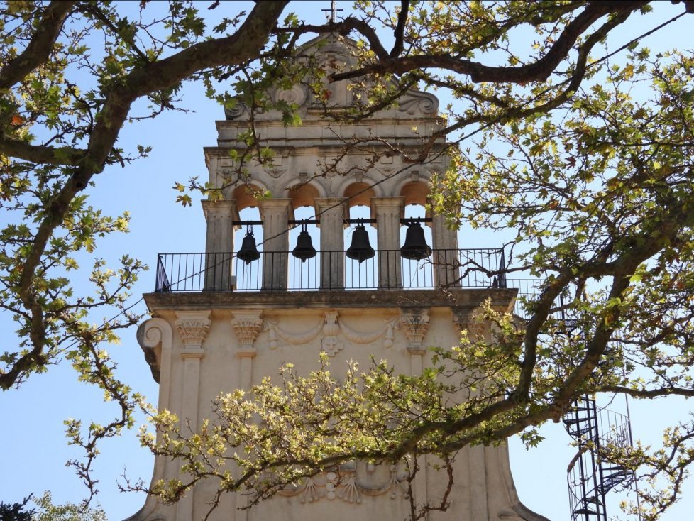 De door gebladerte omlijste klokkentoren van het Agios Gerasimos-klooster werd door mevrouw Tellendonk prachtig op de foto gezet tijdens haar vakantie op Kefalonia.