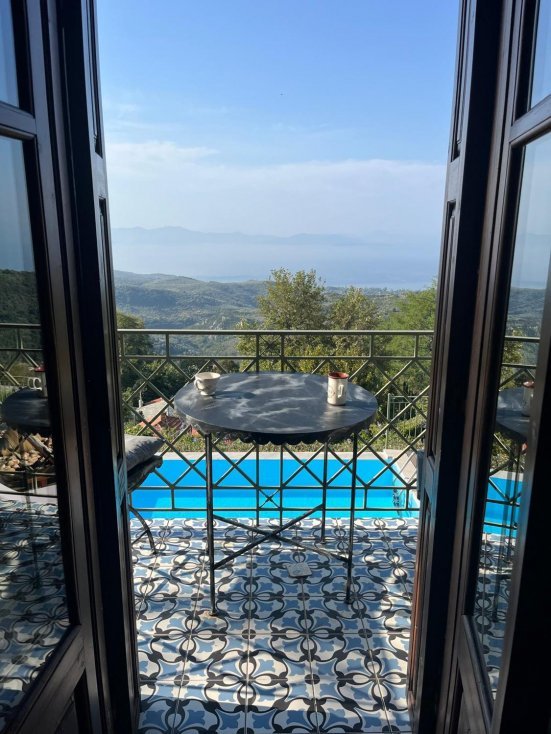 Vanaf haar balkon in Villa Ortansia genoot mevrouw Graafland tijdens haar vakantie op Pilion dagelijks van het adembenemende uitzicht.