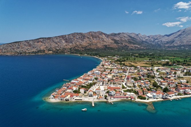 Het enige bewoonde eiland van een kleine groep eilandjes in de Ambracische Golf. Een dorp dat als schiereiland verbonden is aan het vaste land.