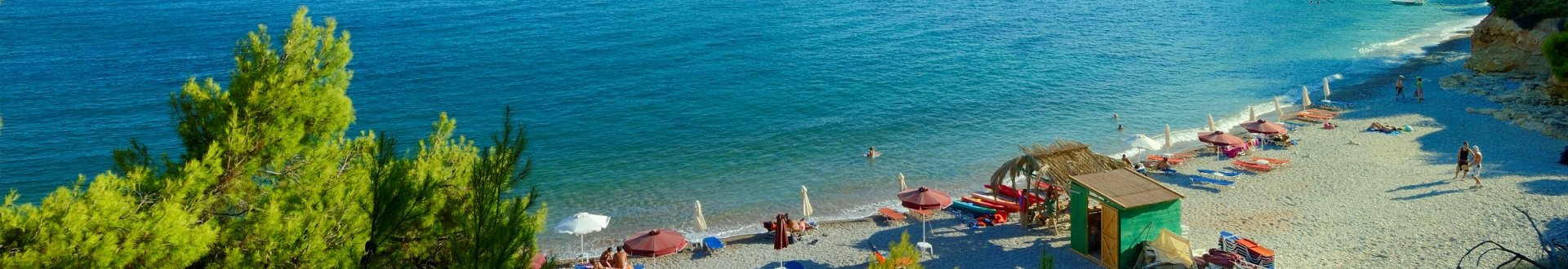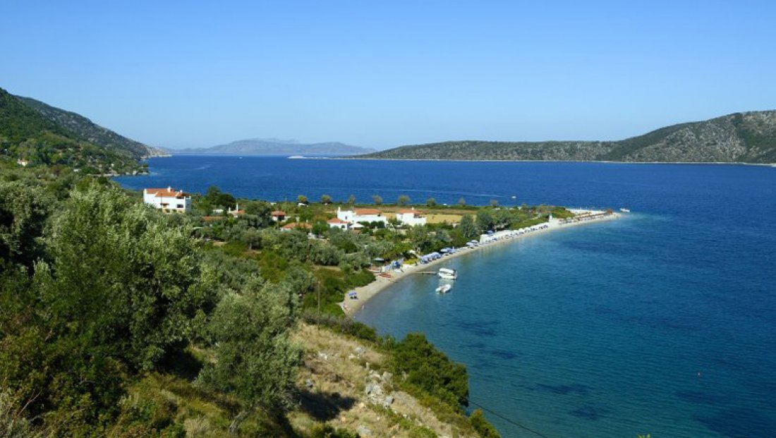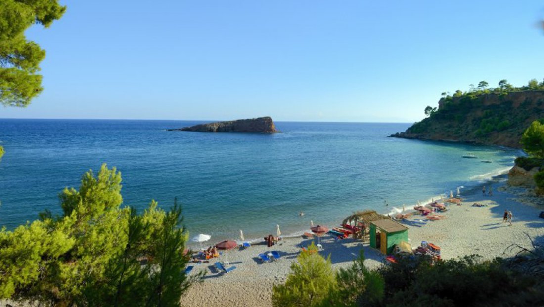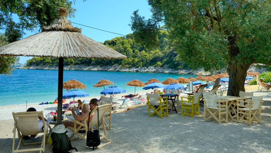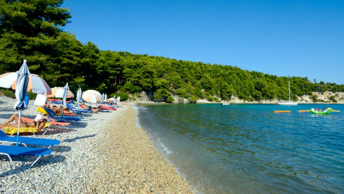 Dit strand is een waar palet van kleuren. De witte kiezels, het turkooise water en de groene omgeving met bomen die tot aan zee reiken, maken dit een idyllische plek. Niet voor niets maken excursiebootjes die op weg zijn naar Skopelos of Skiathos hier in de zomer regelmatig een tussenstop. Tavernes aan het strand maken het verblijf compleet.
