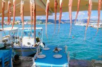 Om de hoek, aan de zuidkant van het plaatsje, ligt de kustweg met visrestaurants die eindigt bij het kleine eiland Kranai, verbonden met het vasteland door een korte dam. Het beschermt de haven van de stad Gythio tegen de open zee en is door de aanwezigheid van pijnbomen een rustgevende plek en een ideaal uitkijkpunt over de golf richting het Parnonas-gebergte in het oosten en Taygetos in het noordwesten.