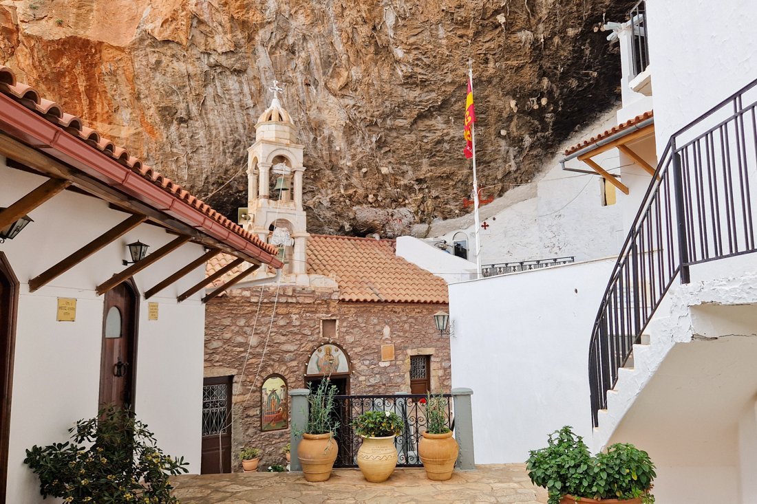 Nu we toch in Leonidio zijn, de weg hier vandaan naar het dorp Kosmas is een van de spectaculairste in Griekenland. U passeert op deze weg het klooster van de Heilige Maagd Elona, dat is gebouwd in een enorme grot tegen de rotswand, die oprijst vanuit de kloof van de rivier de Dafnon. De oorsprong van het klooster gaat terug tot de 14e eeuw, toen herders een vreemd licht zagen dat uitstraalde van een praktisch ontoegankelijk deel van de rotswand. Toen de lokale bevolking naar boven klom, ontdekten ze een kaars die een icoon van de Maagd Maria en het Kind Jezus verlichtte. Op die plek werd een kleine kerk gebouwd, maar het toenmalige bouwsel werd verbrand en geplunderd na de mislukte revolutie van 1770. De huidige kerk werd gebouwd in 1809 en is nu een klein klooster.