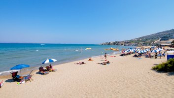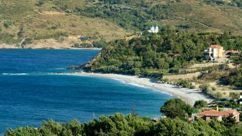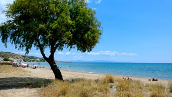 In het noordoosten nabij het dorp Kardamyla ligt dit langgerekte kiezelstrand omgeven door naaldbomenbossen. Het water kleurt helderblauw en loopt langzaam af in zee. In het hoogseizoen opent de beachbar op het strand en hier kan men ontspannen op een van de strandbedden of op de loungekussens.