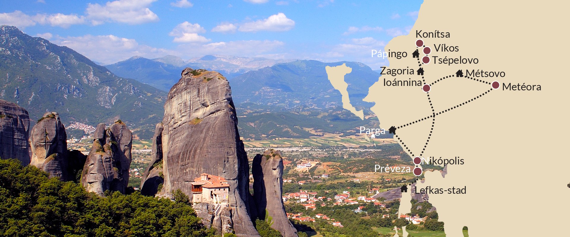 Het dorp Metsovo kent een Alpine-architectuur. De omgeving is een waar wandelparadijs met hoge bergen en dichte bossen. Omdat u in deze omgeving twee dagen bent, raden wij u aan om de Meteora-kloosters bij Kalambaka te bezoeken. Deze kloosters liggen boven op steile rotsen. Die rotsen zelf zijn al een curieus natuurverschijnsel. Deze nacht van de autorondreis brengt u nogmaals door in Metsovo.