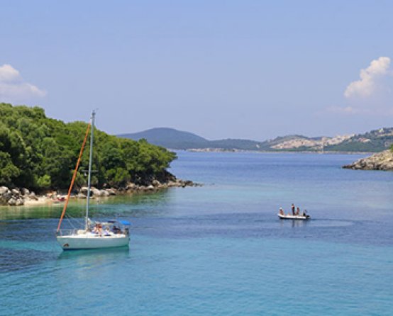Het enige bewoonde eiland van een kleine groep eilandjes in de Ambracische Golf. Een dorp dat als schiereiland verbonden is aan het vaste land.