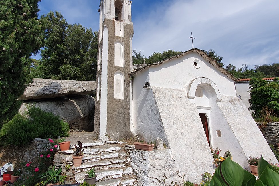 Deze stamt naar men denkt, uit omstreeks 1600 en heeft een rijke collectie aan fresco’s. Deze zijn aangebracht volgens de technieken zoals men op de Heilige Berg Athos in Noord-Griekenland gebruikte. De uit hout gesneden iconostase is nog goed intact gebleven na alle jaren. In 1982 zijn de laatste twee nonnen vertrokken uit het klooster en is het tegenwoordig onbewoond. Een klein eindje verder staat nog een bijzondere kerk behorende tot het klooster. Dit is gebouwd onder een enorm rotsblok, dat tevens het dak van het kerkje vormt. Een smalle trap leidt naar de ingang en binnen kunt u maar net staan. Op een schap liggen enkele schedels van oude monniken.