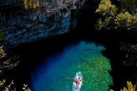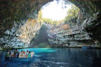 Bij het meer van Melissani komt het water dat in de lagune van Katavothres onder de grond verdwijnt weer aan de oppervlakte. Door de lange reis onder de grond is het zoute water van de zee vermengd met zoet bodemwater. Het meer van Melissani ligt deels in een grot. Deze is maar 500 meter verwijderd van de kust en bereikbaar via een tunnel, die nog niet zo lang geleden door mensen is aangelegd om de toegang tot de grot gemakkelijker te maken. Met een klein bootje kunt u een tour maken over het meer en de grot in. Doordat een deel van de bovenkant van de grot, het dak, ooit is ingestort, is een gat ontstaan en verandert de kleur van het water constant door het spel van de binnenvallende zonnestralen op het meer.