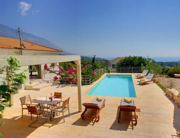 Een villa met privézwembad, met prachtig uitzicht op zee en een ruim terras. Gelegen boven het dorp Trapezaki.