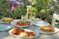 Deze filosofie hanteert ook taverne Platanos, een traditionele, 130 jaar oude kafenion. Platanos ligt aan het plein in Mylopotamos. U kunt zich hier tegoed doen aan traditionele gerechten, met specialiteiten als kokkoras krasatos (haan in rode wijnsaus). “De afgelopen twintig jaar kookt mijn moeder hier,” vertelt Kalliopi, de eigenaresse. “Wat ze vroeger thuis op tafel zette, serveren we nu in de taverne.” Probeer vooral ook eens een lokaal gerecht, zoals de kolokythopita (courgettetaart).
