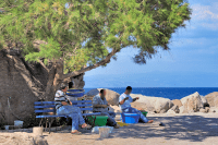 In Skala Sykaminia is de hectische, moderne tijd nog lang niet doorgedrongen. Een groenteboer rijdt langs en prijst zijn waren via de luidspreker op zijn auto, vissers repareren hun netten terwijl ze onderling de laatste nieuwtjes uitwisselen en voorbijgangers kunnen rekenen op een vriendelijke begroeting of praatje.