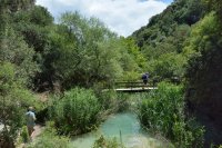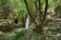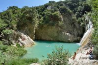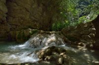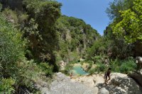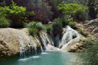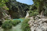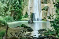 ’s Zomers stroomt er niet zoveel water in het riviertje. In de winter en in het voorjaar wel, dan klatert het water met geraas vanaf de rotsen naar beneden. Als u goed kijkt, ziet u bij het vijvertje een paar waterdieren ongestoord hun gang gaan. Elegante libellen, groene kikkers, hagedissen die rustig op een rots zitten en krabben die genieten bij de waterkant. Dit is waarschijnlijk bijna het enige teken van leven dat u er tegenkomt, want drukbezocht is deze waterval niet. Het is een klein paradijs voor u alleen. Trek uw schoenen uit en laat u voeten even in het heldere, aangenaam koele water glijden. Even bijkomen van de warme dag.