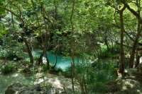 Minder bekend zijn de Kalamari-watervallen. Ze liggen ergens ten noorden van Gialova verscholen in het landschap. ‘Verscholen’ betekent in dit geval niet per se moeilijk te vinden, want borden geven de weg aan. U kunt er met de auto naartoe en het laatste stukje wandelen over het verharde zandpad door de olijfgaarden. Bij het laatste bordje loopt u over een smal pad door de dichtbegroeide bossen en langs rotsen. In de stilte hoort u het geluid van de waterval. Na een aantal bochten wordt de begroeiing minder, en voordat u het doorheeft, openbaart zich de hoge waterval van Kalamari.