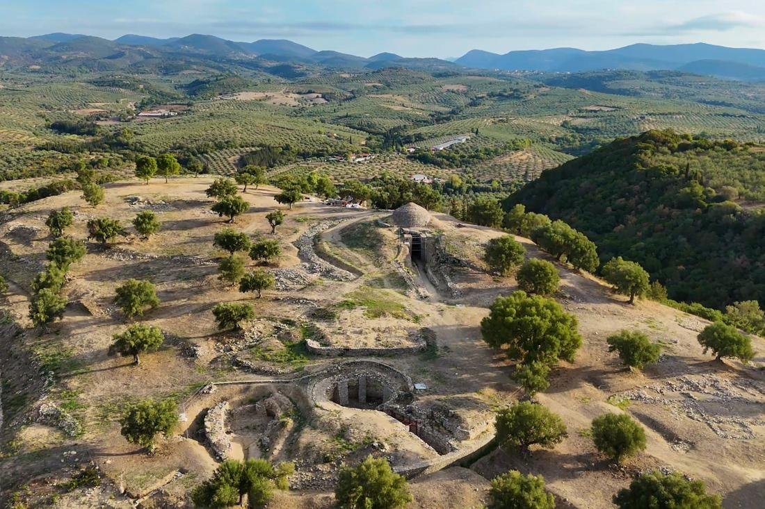 Een tocht landinwaarts geeft u niet alleen een blik op de prachtige omgeving van hellingen gevuld met olijfboomgaarden, maar brengt u na zo'n 5 kilometer tevens bij de archeologische opgravingen van Peristeria. Dit is een Myceense nederzetting waar een aantal koepelgraven werden gevonden. Deze hebben ingenieuze daken in de vorm van bijenkorven en de kostbaarheden die hier gevonden zijn, worden tentoongesteld in het Archeologisch museum in Chora, verder landinwaarts gelegen.