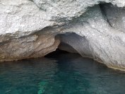 Voor de sportievelingen is er ook een pad dat onderaan de rotsen uitkomt. Vandaar heeft u een blik over het water, maar is uiteraard minder spectaculair van vanaf de zee. Toch ziet u daar wel hoe de kleur van de rotsen fel afsteken tegen het blauwe water van de zee. Het typische wit en blauw van de Cycladen komt hier goed tot uiting.