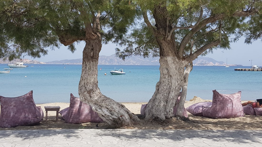 Pollonia bestaat uit twee delen: een deel strekt zich uit langs de haven en het andere ligt aan de overkant van de kleine baai. De tavernes liggen zij aan zij langs de kade en een keuze maken waar u moet gaan, is een moeilijke. Ze lonken allemaal naar u: de geur van smakelijke gerechten doet u zeker watertanden. In het andere deel hebben appartementen en hotels zich verzameld. Een wandelingetje langs het strand brengt u van het ene in het andere deel. Op het zandstrand staan enkele bomen zodat u kunt genieten van de natuurlijke schaduw.