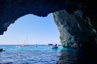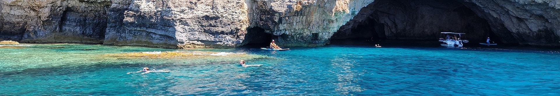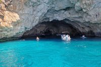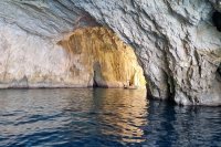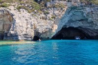 De grotten zijn een natuurwonder dat zich uitstrekt over 1200 meter, leidend naar het hart van het eiland. Ze worden omringd door hemelsblauw water, wat meteen de naam verklaart. Het aquablauwe water en de reusachtige hoogten van de grotten bieden ontegenzeggelijk een betoverende aanblik. De dappere zwemmers onder ons kunnen de grotten, die onderling met elkaar verbonden zijn, bekijken door naar de diepte van de grotten te zwemmen. Sommige daarvan zijn zo groot dat cruiseboten en schepen er gemakkelijk in kunnen, zoals de Ypаpandi grot. De rand van één van de grotten is volledig ingestort en vormt een gat waardoor de zon naar binnen schijnt, wat voor een spectaculair schouwspel zorgt. Vogels hebben hier in groten getale hun habitat gevonden. In de stilte van de rotsen, kwetteren de opvliegende vogels zoals zwaluwen en meeuwen, die hier hun voedsel vergaren uit de spelonken van de rotsen. Als u stil blijft zitten, blijven ze boven uw hoofd rondjes fladderen.