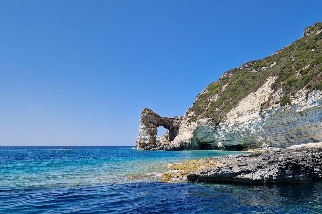 Eenmaal boven aan de boog kunt u de ‘brug’ oversteken en genieten van het uitzicht over de kust en zelfs helemaal tot aan Antipaxos. De brug is breder dan hij lijkt, maar toch alleen geschikt voor waaghalzen. Het panoramische uitzicht op de omringende kustlijn, met zijn grillige kliffen en prachtige blauwe water, is adembenemend. De boog is niet alleen een visueel wonder, maar ook een symbool van de geologische geschiedenis van het eiland. De krachten die deze unieke formatie hebben gevormd herinneren aan de natuurlijke processen die het landschap van Paxos blijven vormgeven. Het biedt een fascinerende blik op de dynamische krachten die onder het aardoppervlak aan het werk zijn.