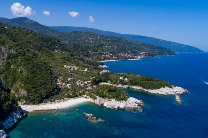 De route naar het bergdorp Trikeri gaat langs verscholen baaien en de witte huizen springen al snel in het oog. Het haventje van Trikeri ligt iets verderop en heet Agia Kyriaki.