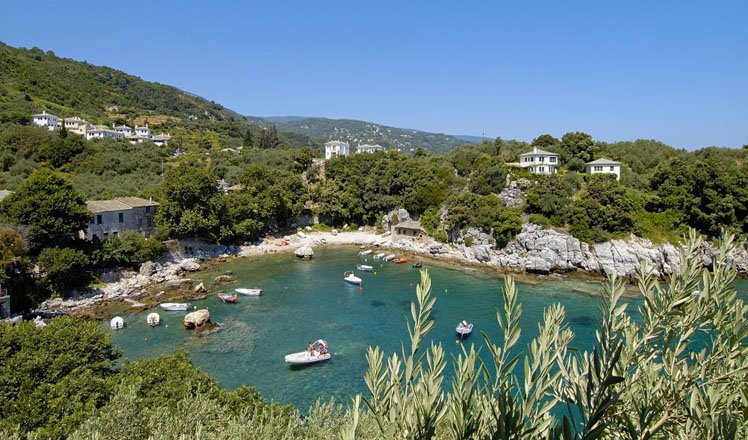 Volgens een Venetiaanse legende komt de naam Damóuchari van de Griekse uitdrukking ‘dos mou hari’, dat ‘geef mee genade’ betekent en ontleend wordt aan het gebed van de vissers wanneer ze in gevaar verkeerden. Het is een panoramisch plekje met olijfboomgaarden tot aan de zee met twee stranden en heeft het schilderachtige karakter weten te behouden.