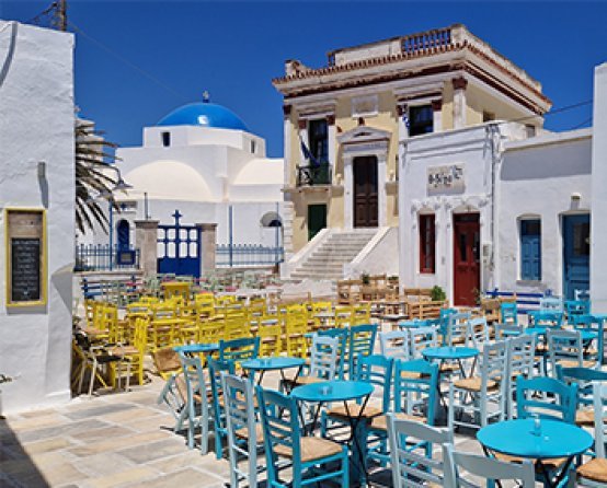 Een van de mooiste hoofdsteden van de Cycladen. Traditionele witte huizen die tegen de roodbruine rotshelling lijken te kleven.