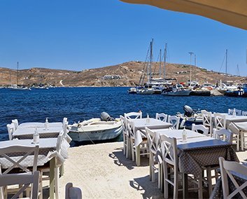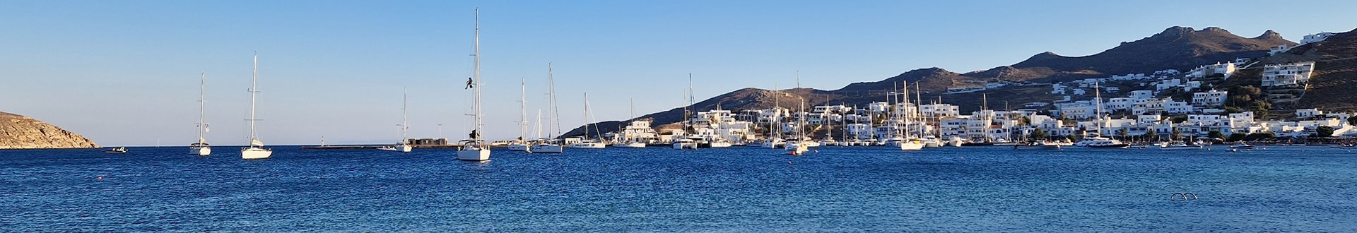 Net iets buiten Livadi gelegen kamers en suites met prachtig uitzicht over de baai en op Chora.