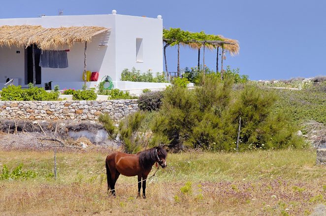 Als uw ogen zich eenmaal hebben kunnen losrukken van dat beeld, wandelt u helemaal terug naar het punt op het hoofdpad waar u eerder linksaf geslagen bent en vervolgt u de weg. Het volgende pad links leidt naar het kapelletje van Ágios Antónis. Volgt u het pad. Achter het kapelletje is op de grond een met stenen omgeven cirkel. Hier werd vroeger het kaf van het koren gescheiden, waar vaak de wilde pony’s voor werden gebruikt. Van hieruit loopt een pad, dat een beetje lijkt op een rivierbedding, links naar beneden en dit komt weer uit op het hoofdpad. De weg blijven volgen tot deze eindigt in een asfaltweg. Daar ziet u de aanduiding rechtsaf richting Péfkos. Ga daarentegen linksaf richting hoofdweg. Op de hoofdweg kunt u de bus nemen of uw wandeling vervolgen met de tocht van Acheróunes naar Linariá.