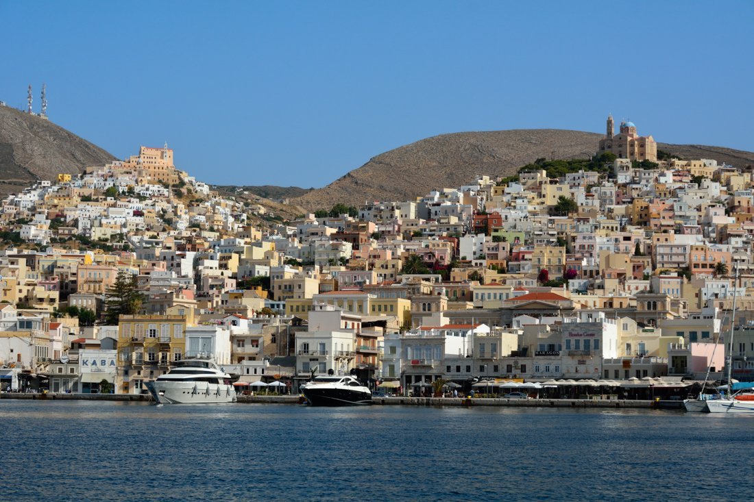 De hoofdstad Ermoupolis wordt ook wel de Koningin van de Egeïsche Zee genoemd. Nadat Chios geheel verwoest was, bouwden de vluchtelingen afkomstig van dit eiland de stad Ermoupolis, de stad van Ermis, god van de handel en het schrift. De stad maakte een grote groei door en ontwikkelde zich als de eerste haven van Griekenland. Inmiddels is deze drukte weer geluwd en is de stad een fijne plek om tijd te spenderen. Auto’s worden geweerd en dienen aan de rand van de stad geparkeerd te worden. Er rijden bussen die bezoekers van een centrale parkeerplaats naar het centrum brengen. Een wandeltocht langs het water en de tavernes, leidt naar de haven waar menig jacht ligt te pronken. Het af- en aanmeren is een lust voor het oog. In de achterliggende straten is het rijke verleden nog goed te proeven. De stad is een groot openlucht museum. Langs de smalle straten liggen tal van herenhuizen, het stadhuis, de kerk van Agios Nikolaos en het theater van Apollo zijn slechts enkele punten die om een bezoek vragen. De tavernes aan het water serveren overheerlijke maaltijden en de volta, het langs lopen van mensen om te zien en gezien te worden, is een goed tijdverdrijf.