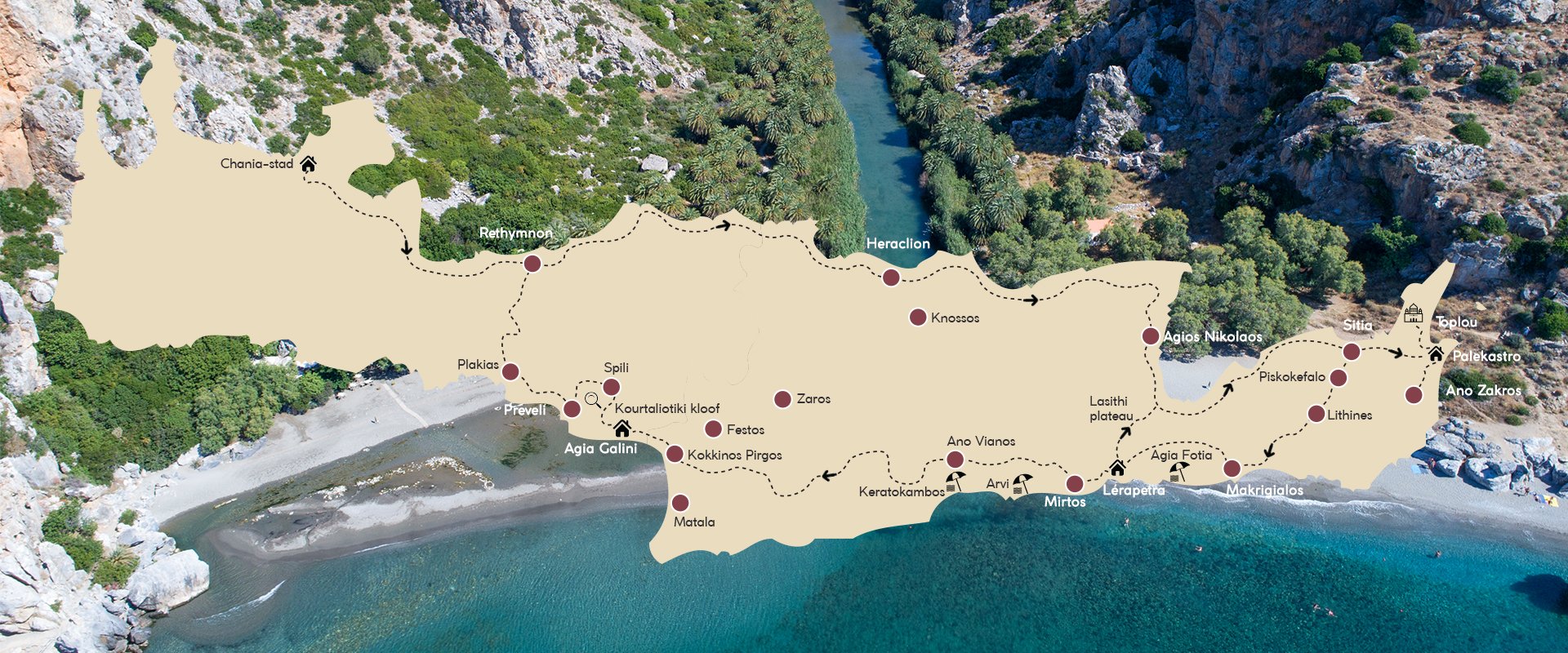 Tijdens de route naar Chania passeert u het dorp Spili, met de leeuwenkoppen waaruit ijskoud water stroomt. Vervolgens leidt de weg door de indrukwekkende Kourtaliotiki-kloof en komt uit bij Preveli. Het gelijknamige 16e eeuwse klooster ligt op de heuvel. Er daalt een pad af naar de kust waar een rivier door de kloof in zee stroomt. De rivier heeft hier een lagune met watervalletjes gevormd, omgeven door palmbomen en rotspartijen. Plakias vormt een prima stop voor de lunch van vandaag. Het strand strekt zich uit langs het dorp en de terrassen aan het water ontvangen u met plezier.