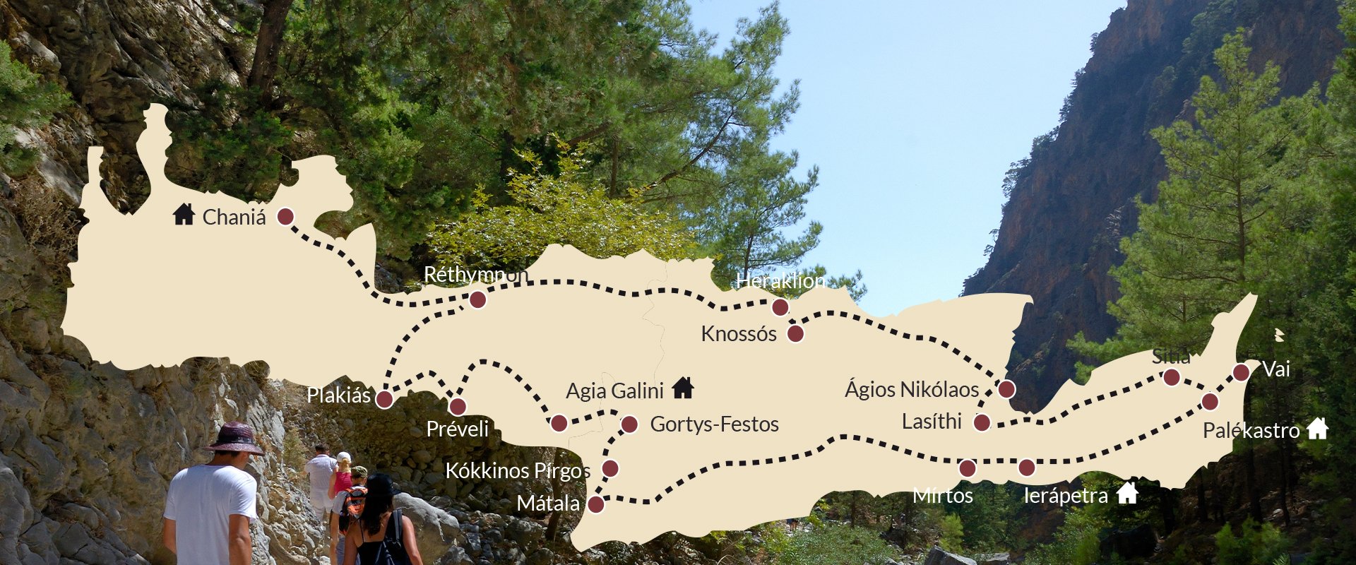 Bij het bepalen van de autorondreis route stond ons voor ogen dat wij u niet alleen zoveel mogelijk van het karakteristieke landschap van Kreta wilden laten zien, maar u ook kennis wilden laten maken met de charme van authentiek Kreta. Om de drukkere toeristische centra te ontwijken, is de eerste rit het langst. Tijdens de route zijn de kamers met douche en toilet in de hotels op basis van logies en ontbijt voor u gereserveerd.