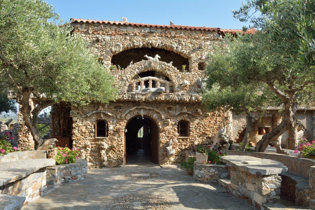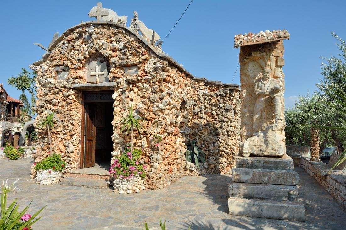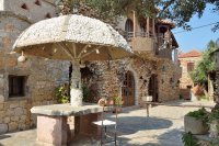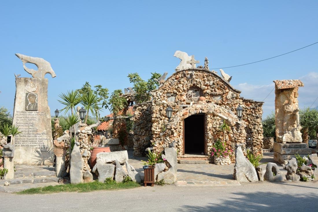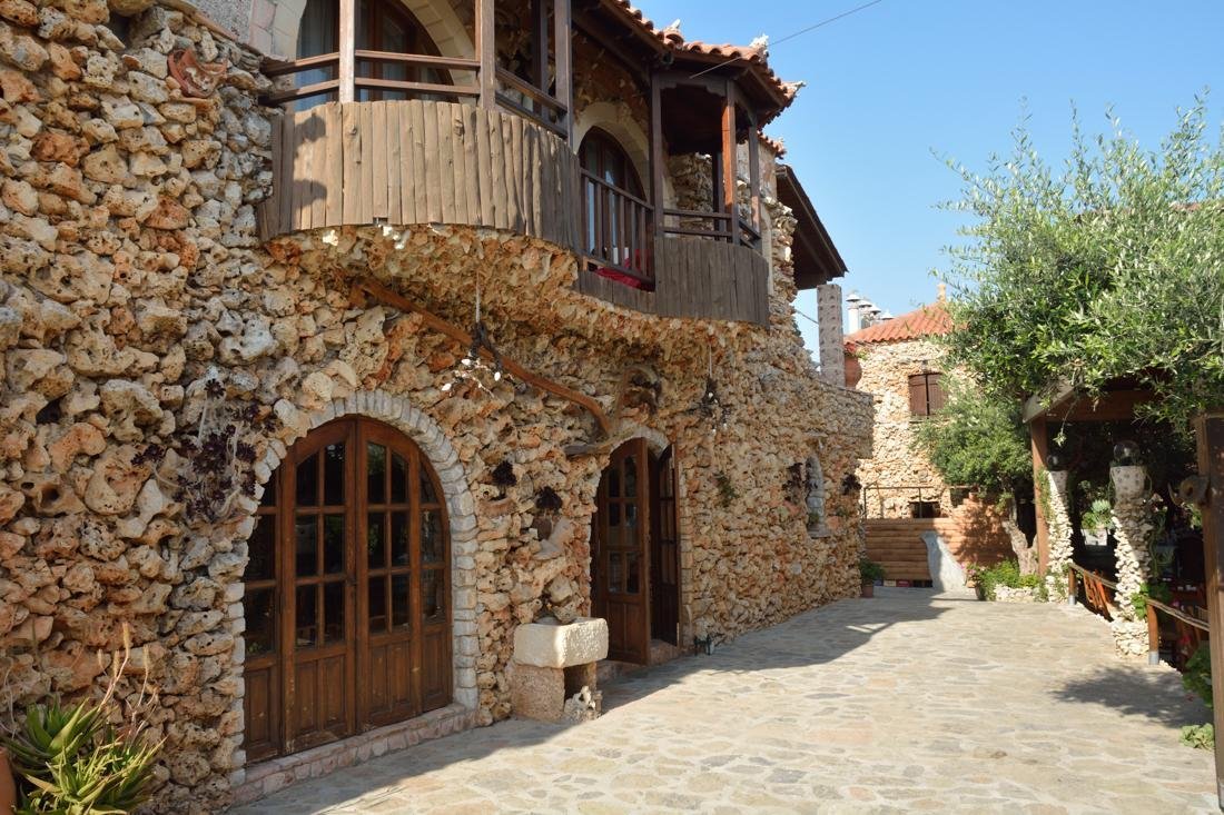Met werkelijk alle soorten en maten stenen afkomstig uit de Witte Bergen, Lefka Ori, werd met veel creativiteit niet alleen een taverne gebouwd, maar alle bouwsels en versieringen zijn hier gemaakt uit steen: van het kerkje bij de ingang, de tafels tot zelfs de parasols en de toiletten. En alsof deze kleine kunstwerken nog niet genoeg zijn, doet de taverne tevens dienst als een soort museum met materiaal uit de Tweede Wereldoorlog en oude Kretenzische gebruiksvoorwerpen.