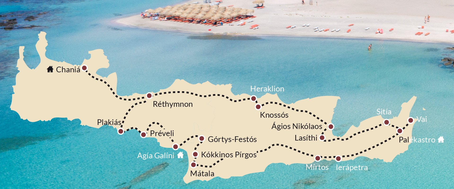 Om alle facetten van Kreta te leren kennen, hebben wij in samenwerking met onze agent Atropa Travel een interessante route voor u samengesteld. Deze gaat over heel Kreta en geeft een goede indruk van het eiland.