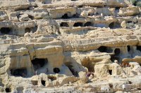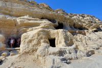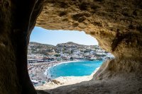 De witte krijtrotsen van Matala vormen een levendig contrast met het helderblauwe water van de baai. Hippies vanuit de hele wereld stroomden hier in de jaren zestig en zeventig samen om zich terug te trekken in eeuwenoude holen in de rotsen. Van een slaperig vissersdorp veranderde de plaats in een hippiedorp met wereldwijde bekendheid.