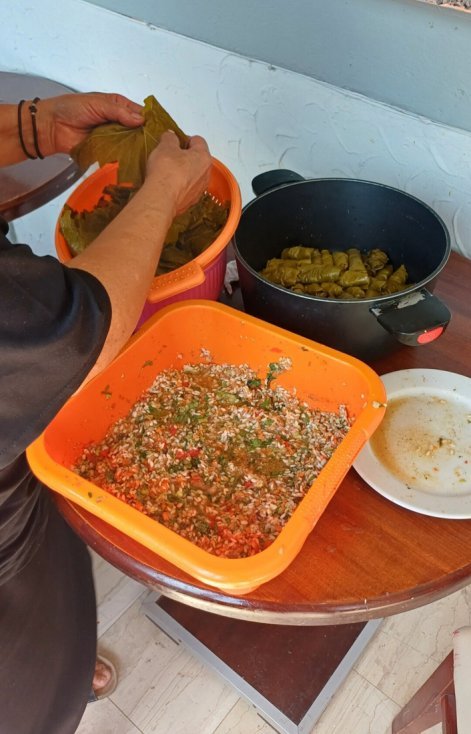 Dit tafereeltje van een Griekse yiayia die van druivenbladeren dolmades maakt, werd door mevrouw van Schaik tijdens haar vakantie op Lesbos op de foto genomen.