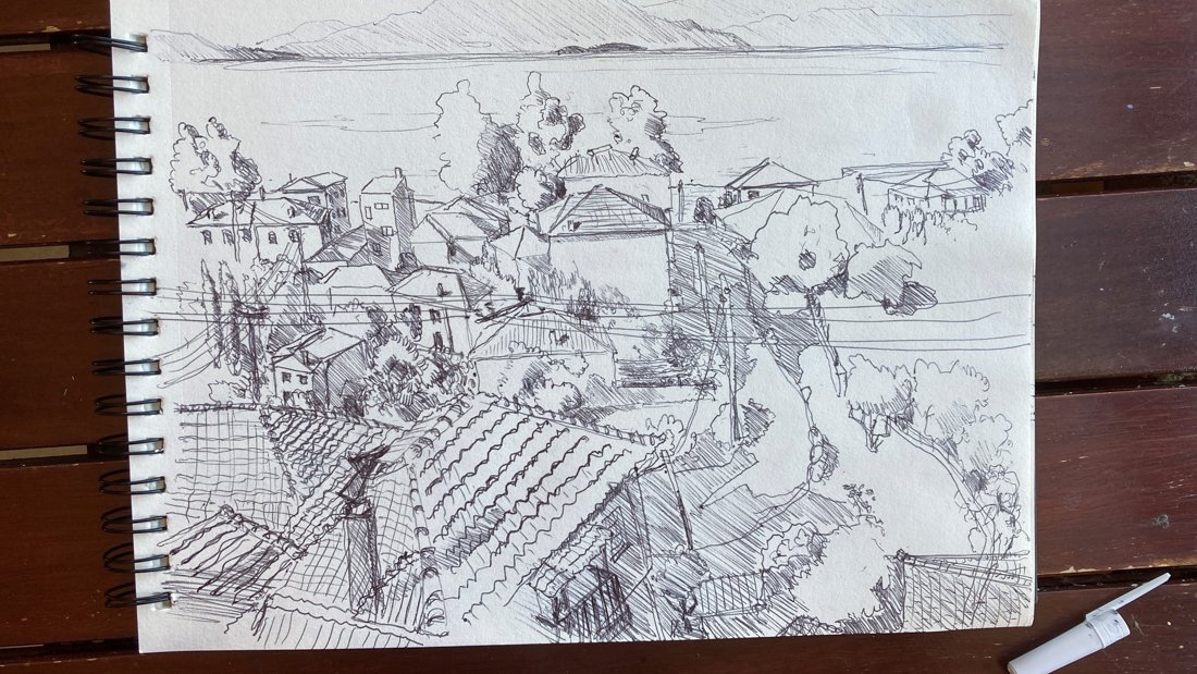 Vanaf zijn balkon in Huize Sofia schetste mijnheer van Soest tijdens zijn vakantie op Pilion het uitzicht over Afissos.