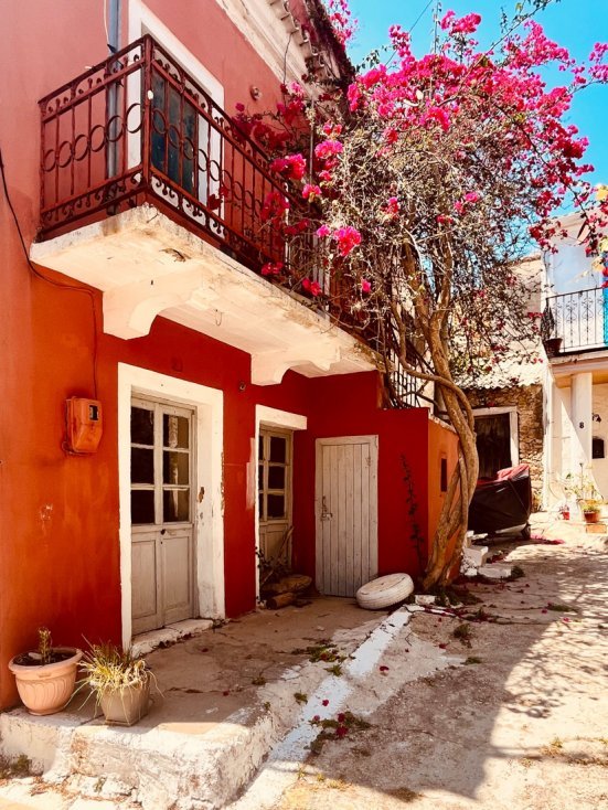 De huizen en de mooie kleuren van Chlomos maakten de pittige wandeling van mevrouw van der Meer tijdens haar vakantie op Corfu meer dan de moeite waard.