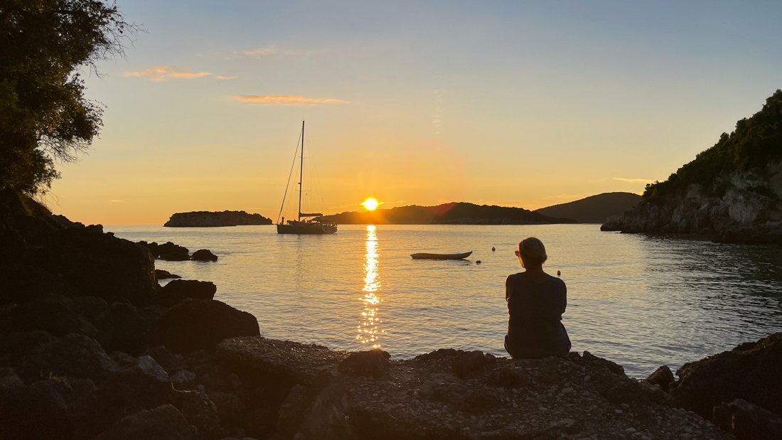 Meneer en mevrouw Zaalberg ontdekten tijdens hun vakantie een klein, verborgen strandje op slechts twee minuten lopen van Paxos View Studios. Daar genoten ze in stilte van een betoverende zonsondergang, die meneer Zaalberg voor altijd vastlegde.