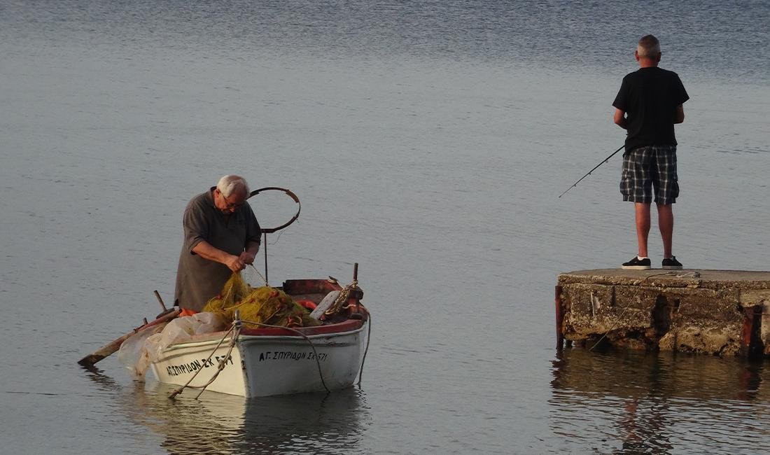 De heer van der Ende stuurde deze foto in. De foto is gemaakt in Messonghi op het eiland Corfu. U ziet hier twee vissers die op verschillende manieren vissen vangen.