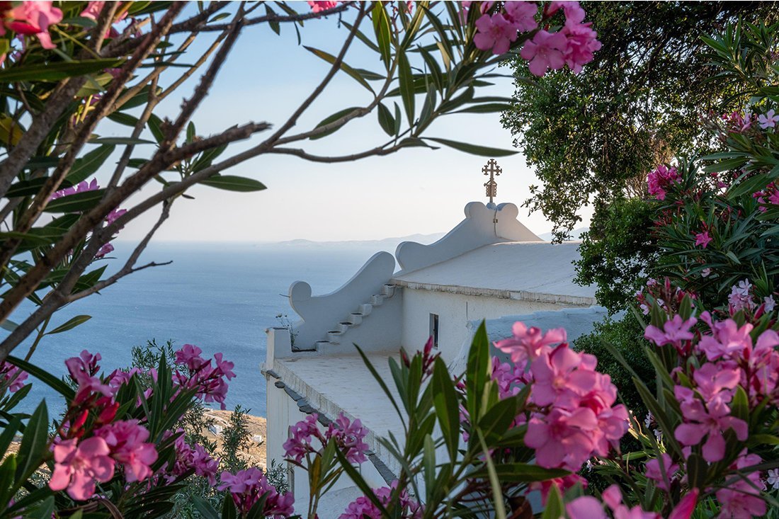 Tijdens haar vakantie op Tinos viel het oog van mevrouw Kila op dit door felgekleurde oleanders omlijste kerkje.