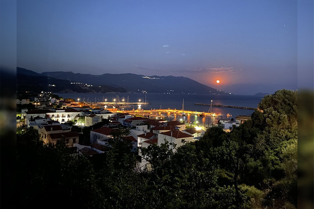 Na een avondwandeling liepen de heer en mevrouw Van Tilburg van Kampos terug naar Ormos en hadden zij een prachtig uitzicht op het knusse haventje van Ormos.
