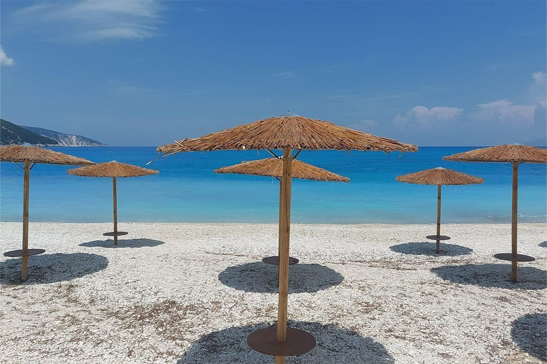 Vlak bij Zola bevindt zich een vrijwel verlaten strand. De heer Achterberg zag tijdens zijn verblijf op Kefalonia enkel een toerist en wat verlaten parasols die prachtig afsteken tegen het blauw van de zee.